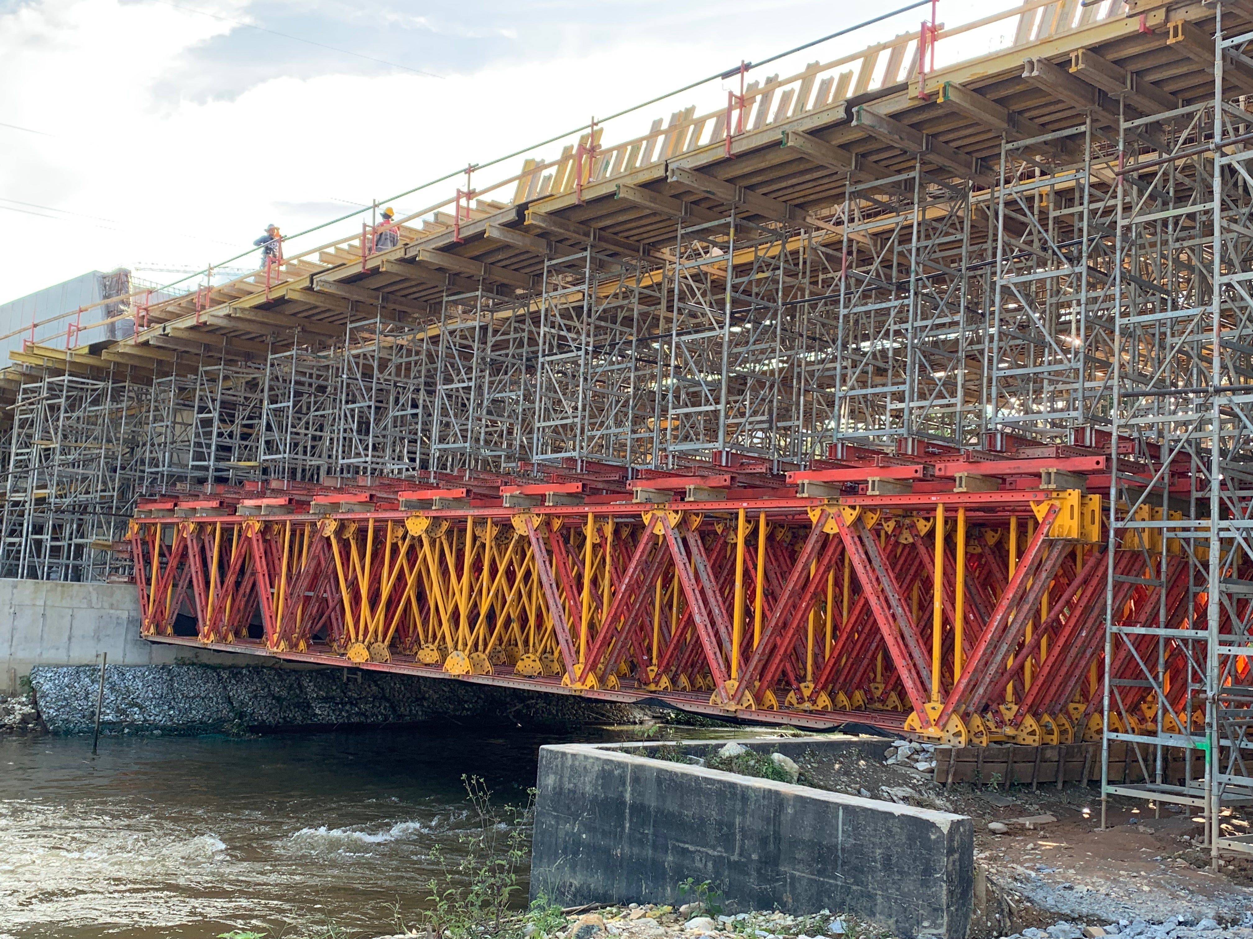 En la segunda etapa de la losa del puente, el sistema ALPHAKIT y ST-100 siguió desempeñando un papel fundamental en el soporte estructural. La rigidez del sistema y su facilidad de montaje aseguraron la alineación precisa de los elementos constructivos, contribuyendo al éxito del proyecto. Esta solución de PERI permitió mantener los estándares de calidad exigidos y garantizar la durabilidad de la estructura final.