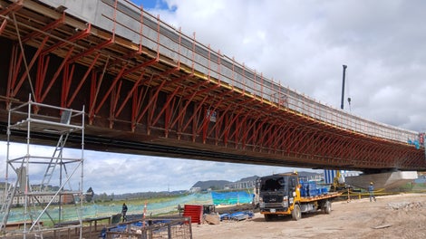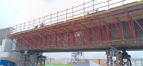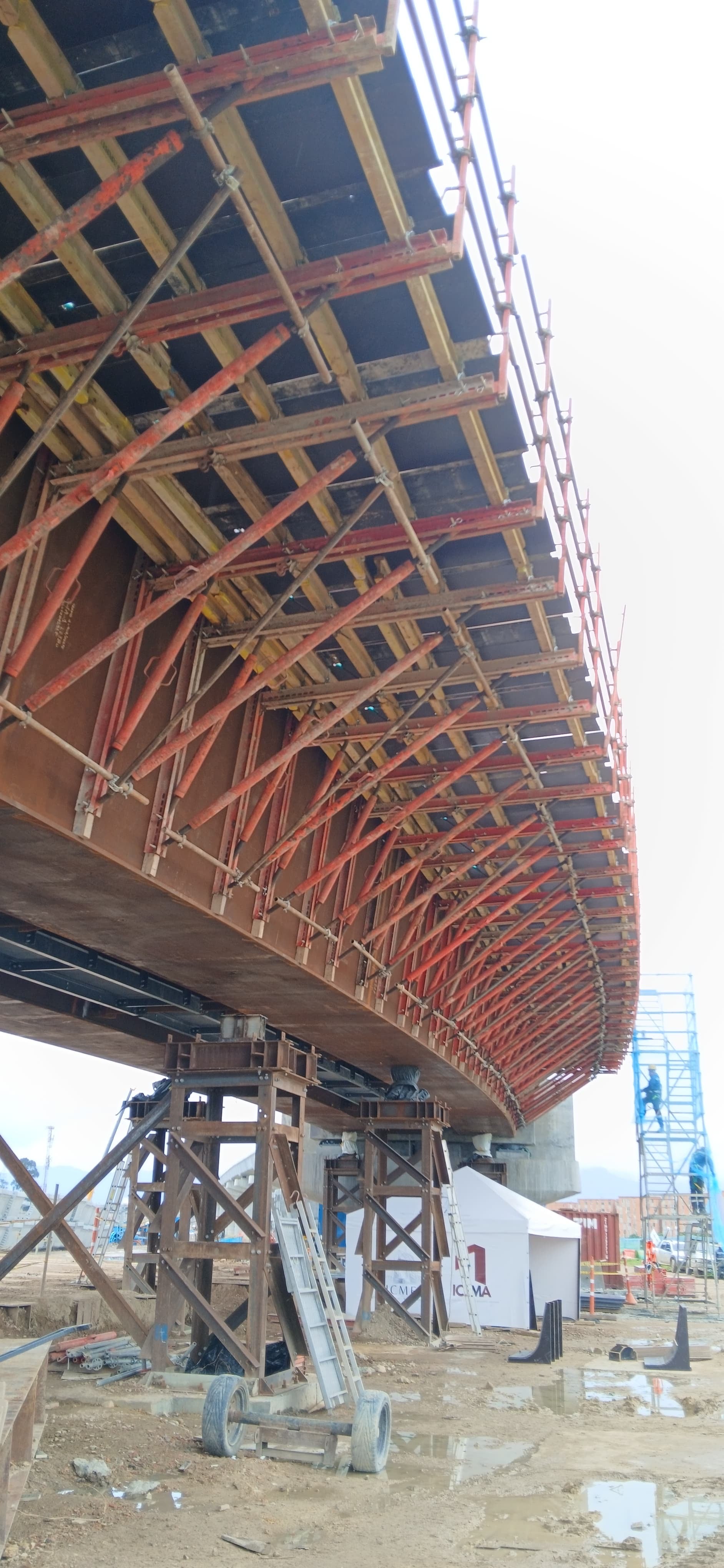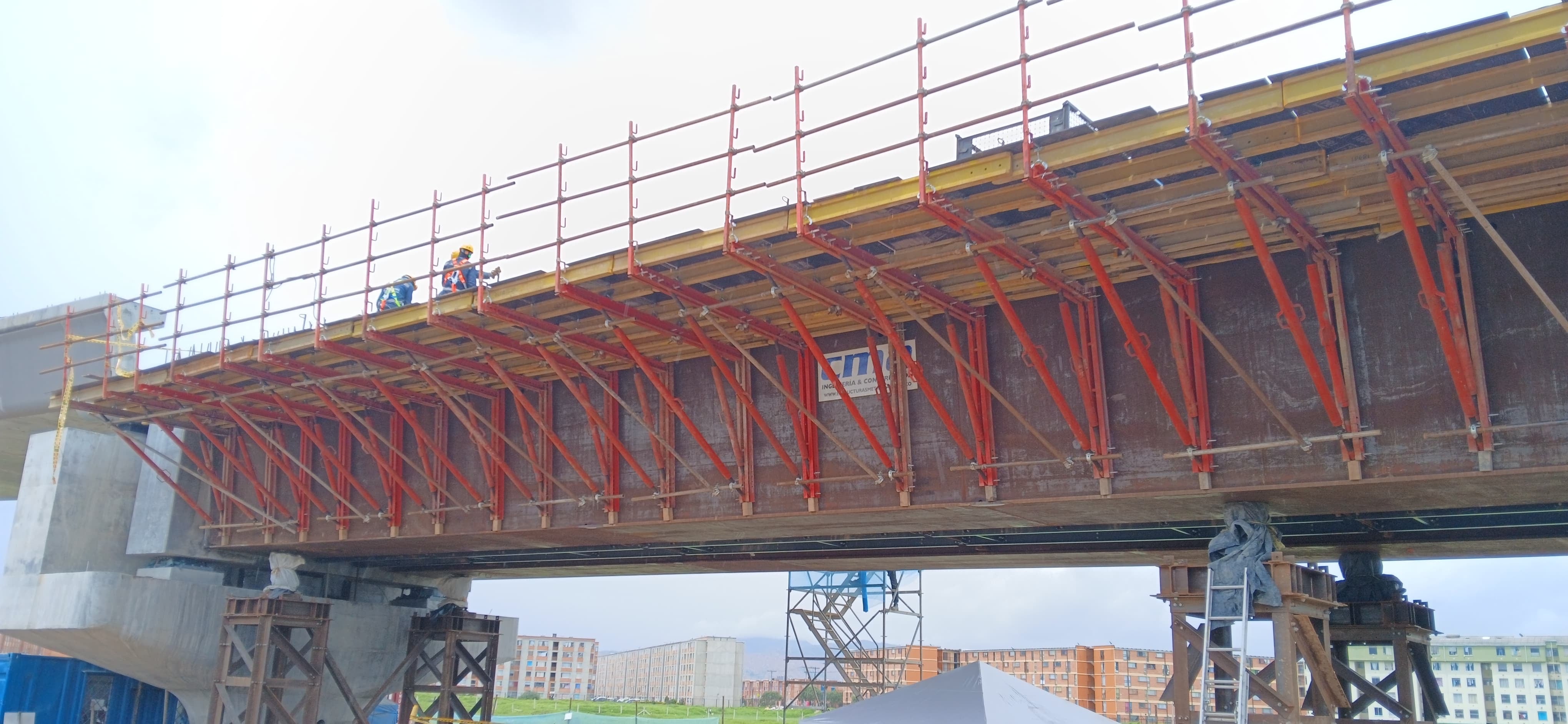 PERI diseñó un sistema de ménsulas adosadas a la estructura metálica con VARIOKIT, adaptado a las condiciones específicas del puente, lo que permitió realizar el vaciado de diafragmas y volados de forma segura y eficiente.